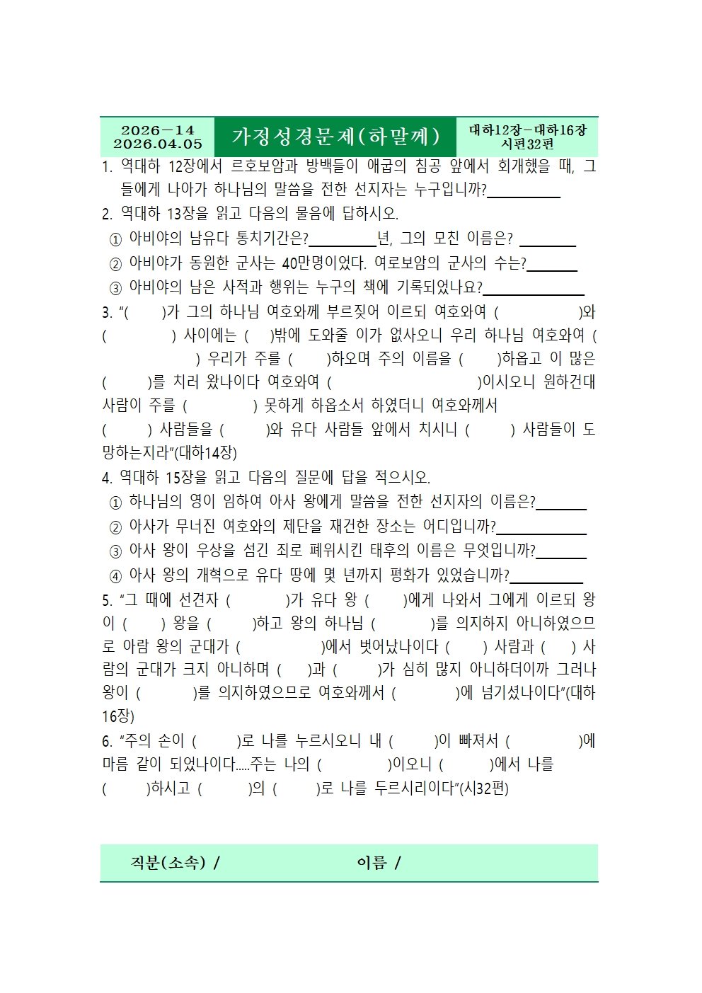 [가정성경문제]2026년4월5일, 역대하12장-16장, 시편32편